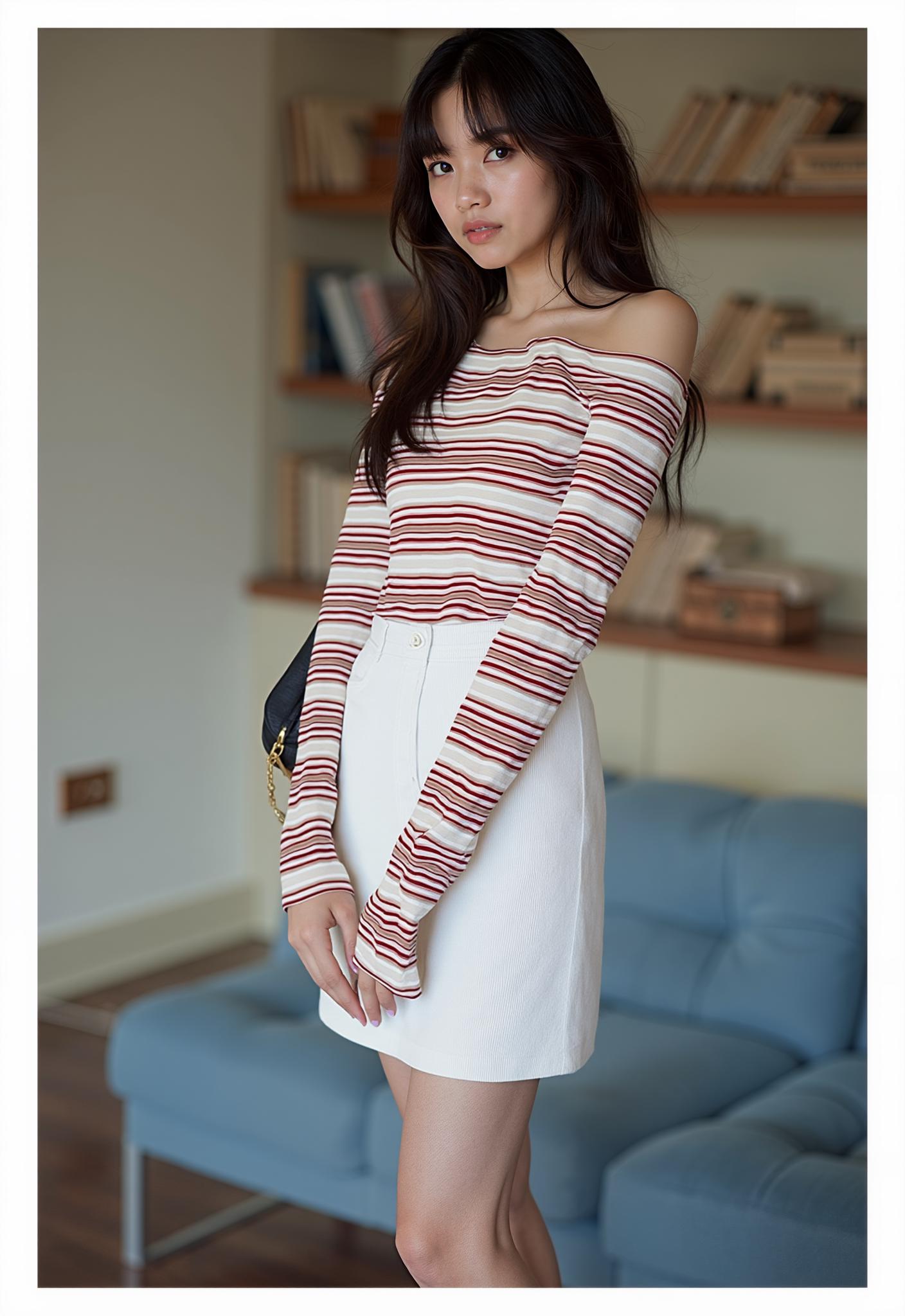 A Woman Wearing A Striped Top And White Skirt Stands In A Cozy Room With A Bookshelf And Blue Sofa In The Background