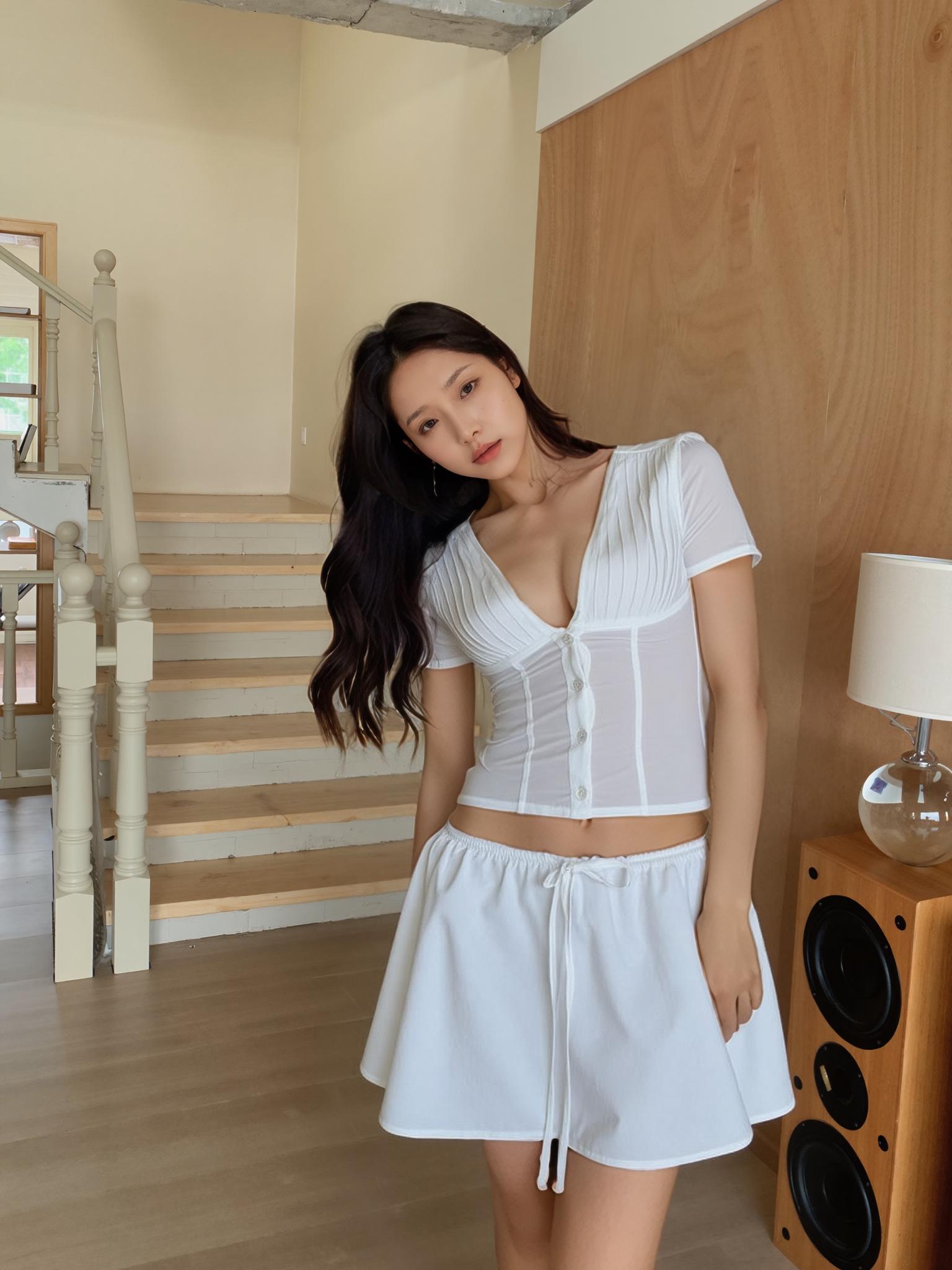 A Woman Wearing A White Outfit Poses In A Modern Minimalist Interior With Wooden Accents And A Staircase In The Background