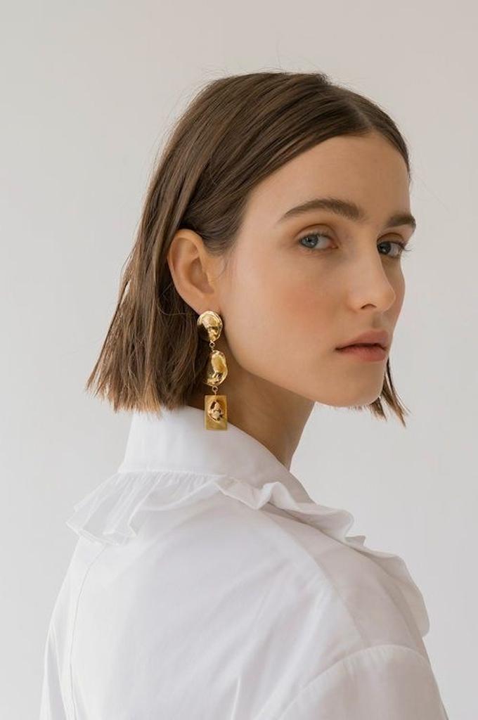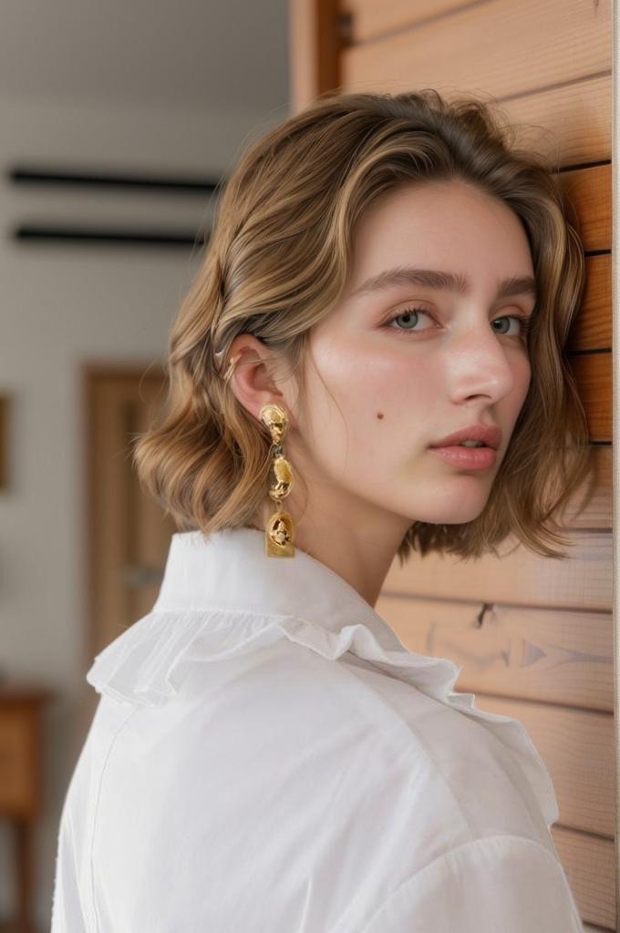 A Woman With Short Wavy Hair And Gold Earrings Is Standing Indoors Against A Wooden Wall Wearing A White Shirt