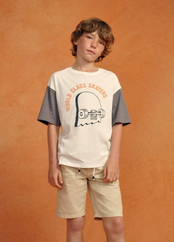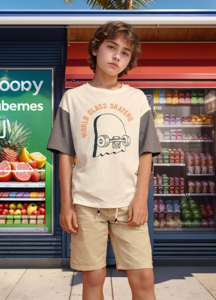 A Young Boy Stands In Front Of A Colorful Fruit And Beverage Stand On A Sunny Day
