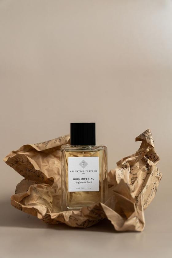 A Bottle Of Essential Parfums Bois Imperial Rests Elegantly On Crumpled Paper In A Minimalist Setting