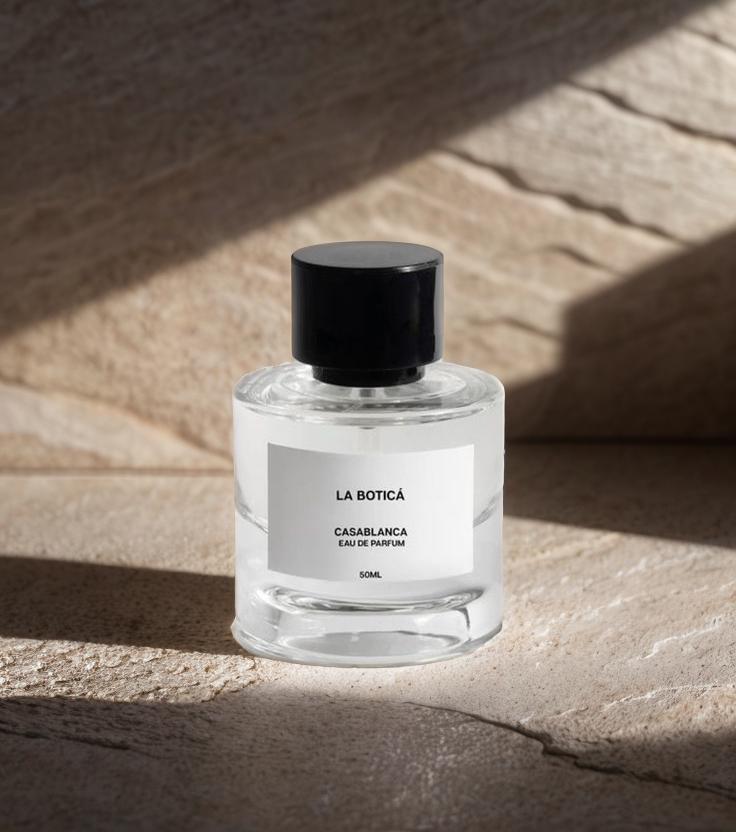 A Bottle Of La Botica Casablanca Eau De Parfum Is Elegantly Displayed On A Textured Stone Surface With Soft Lighting