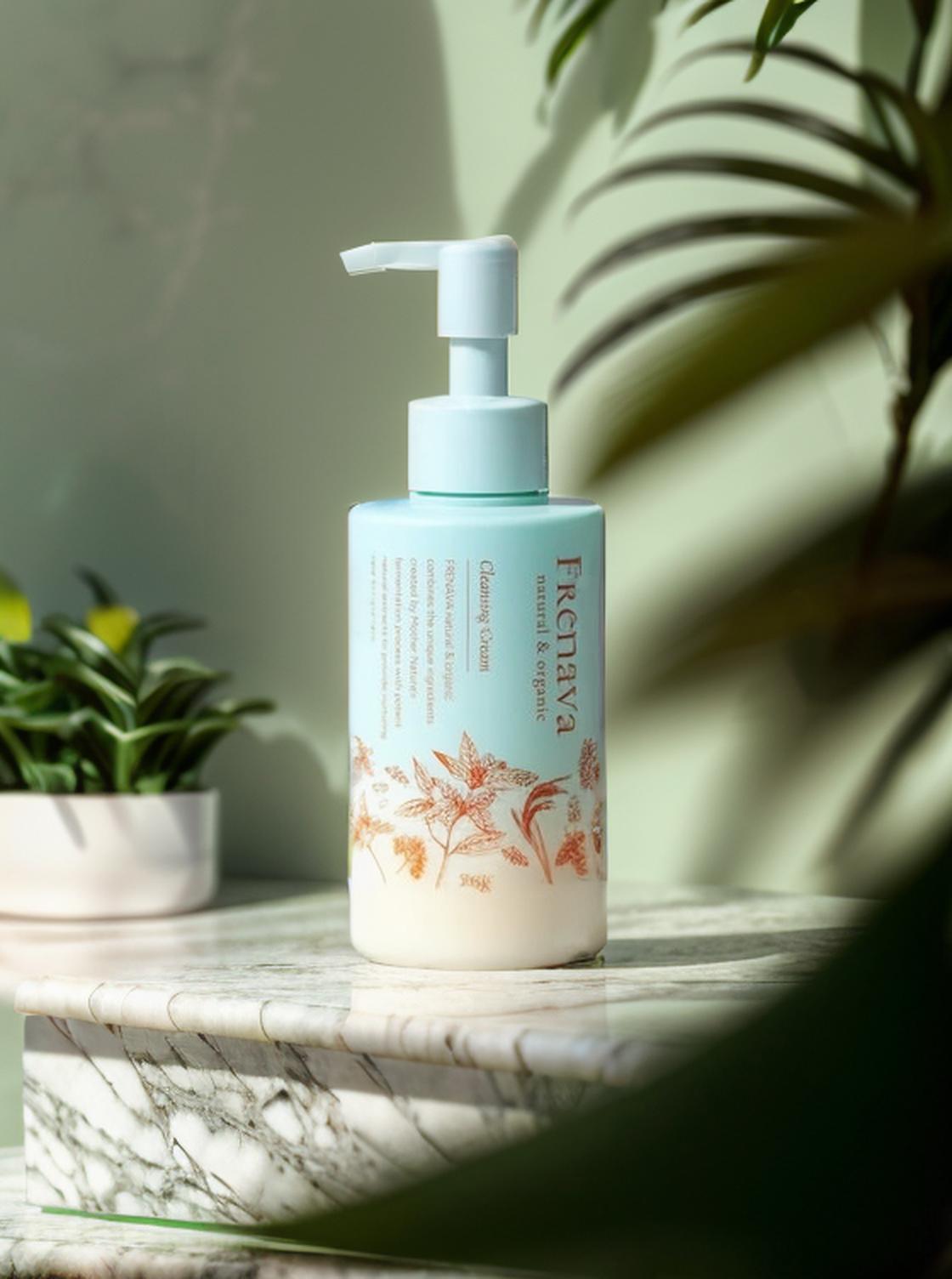 A Bottle Of Organic Cleansing Cream Is Beautifully Displayed On A Marble Surface Surrounded By Indoor Plants