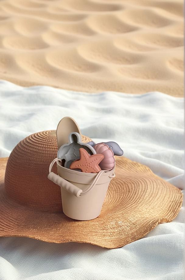 A Bucket Of Beach Toys Sits On A Straw Hat Ready For A Day Of Fun In The Sand