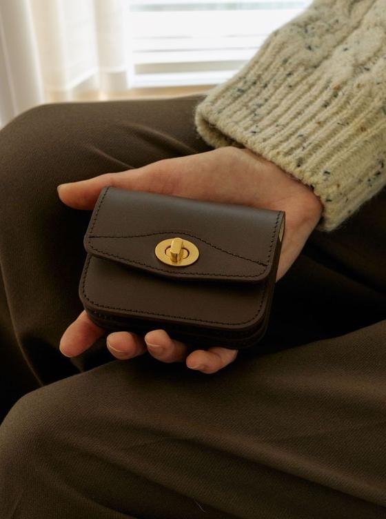 A Person Sitting Indoors Holds A Small Brown Leather Wallet With A Gold Clasp