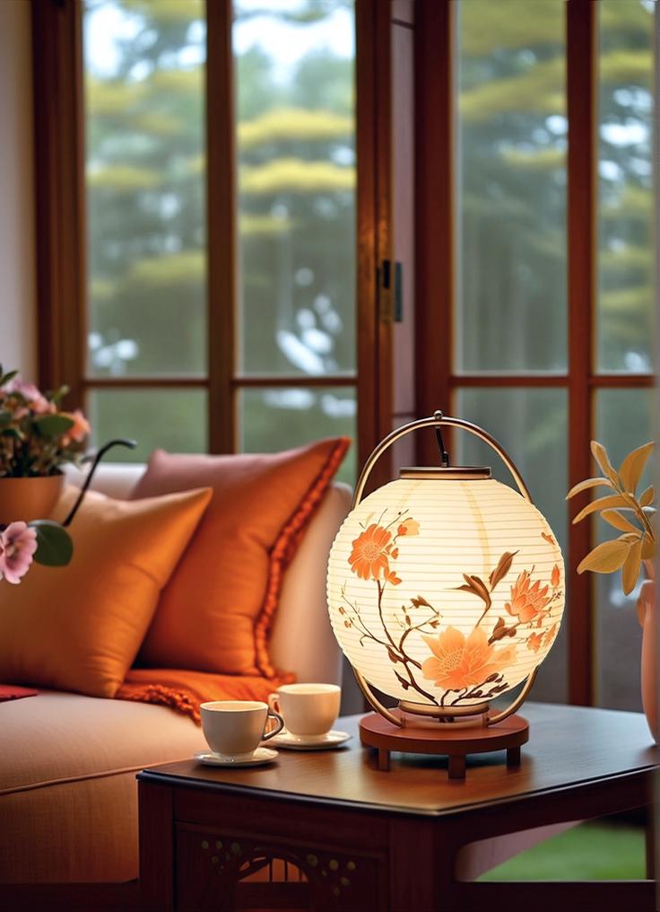 A Serene Setting Featuring An Illuminated Floral Lantern On A Wooden Table Accompanied By Two Cups Of Tea Against The Backdrop Of A Cozy Room With A View Of A Garden Through The Window