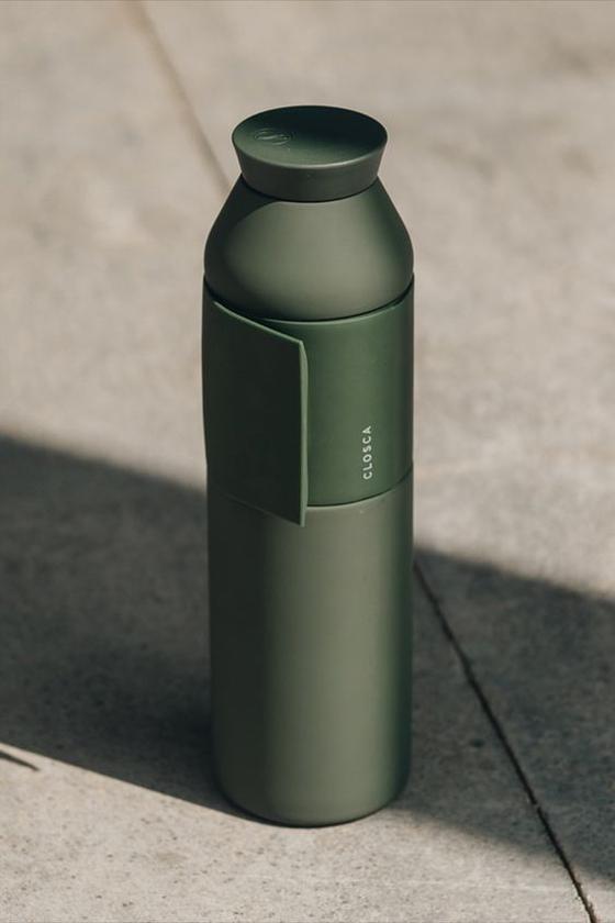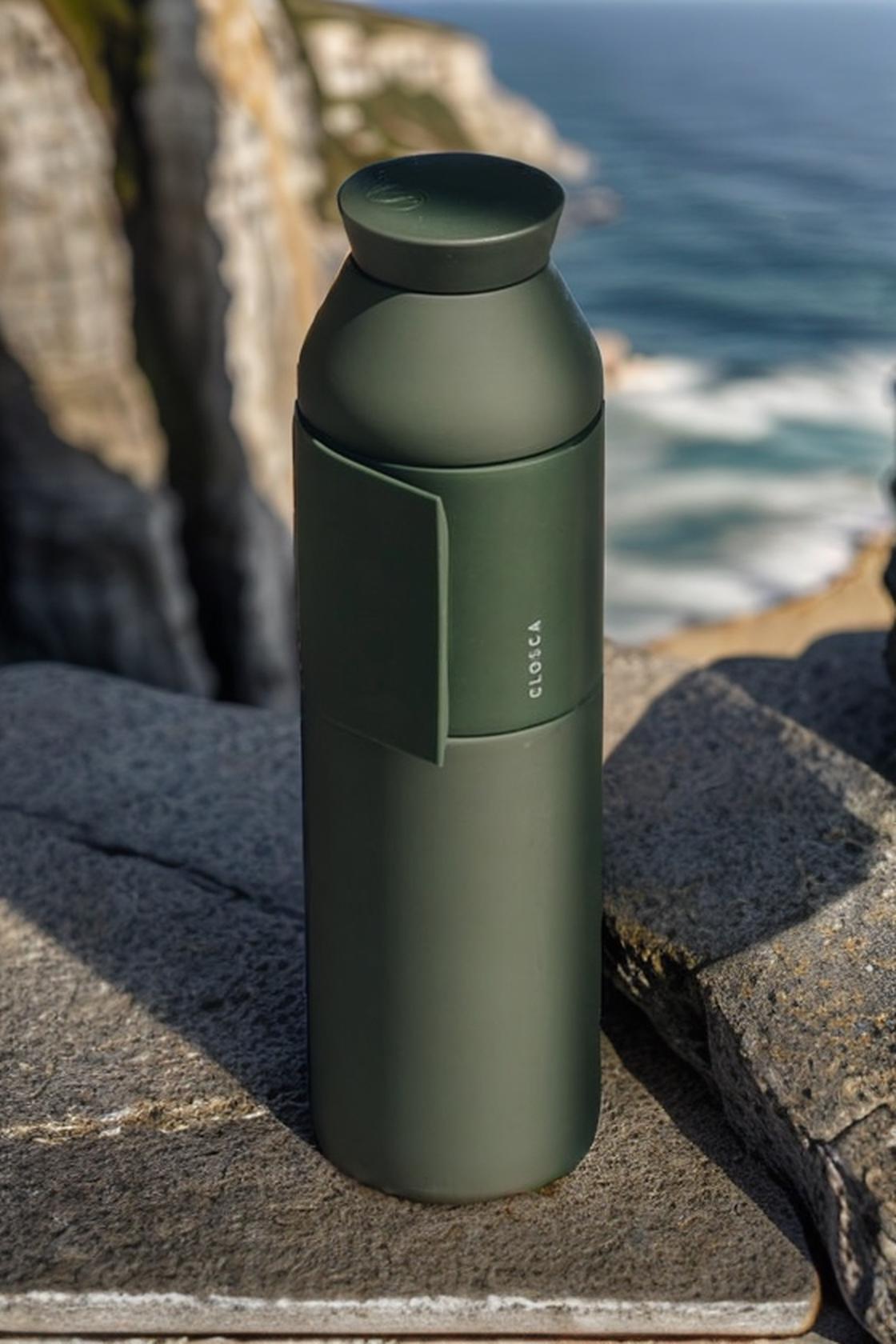 A Sleek Green Water Bottle Sits On A Stone Ledge Overlooking A Scenic Coastal Cliff