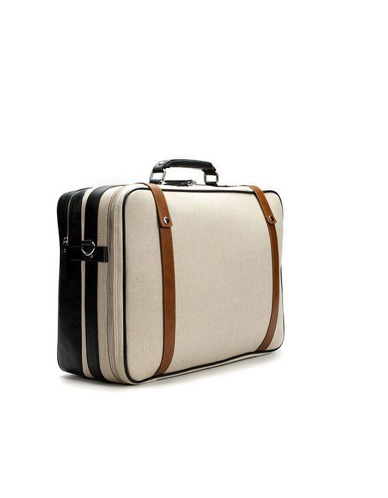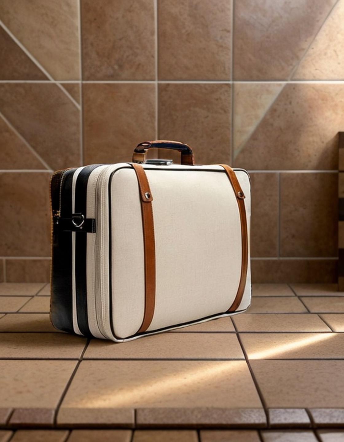 A Stylish Beige Suitcase With Leather Straps Sits On A Tiled Floor In A Well-Lit Room