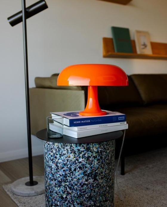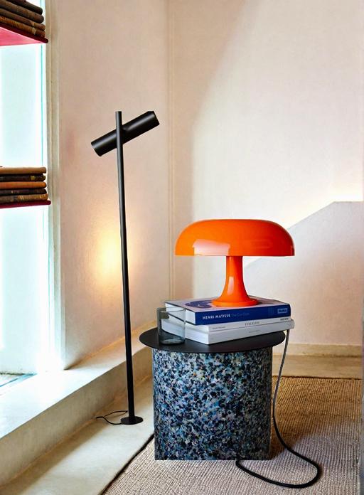 A Stylish Interior Corner Featuring A Vibrant Orange Lamp Modern Floor Lamp And A Stack Of Books