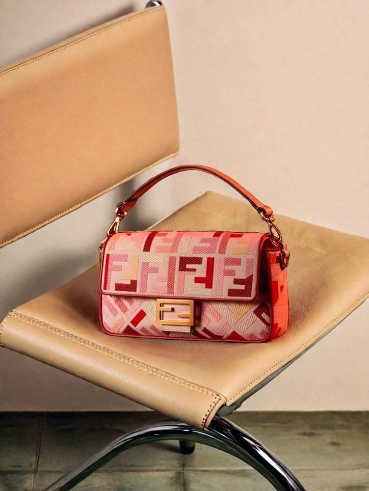 A Stylish Patterned Handbag Sits Elegantly On A Modern Beige Chair