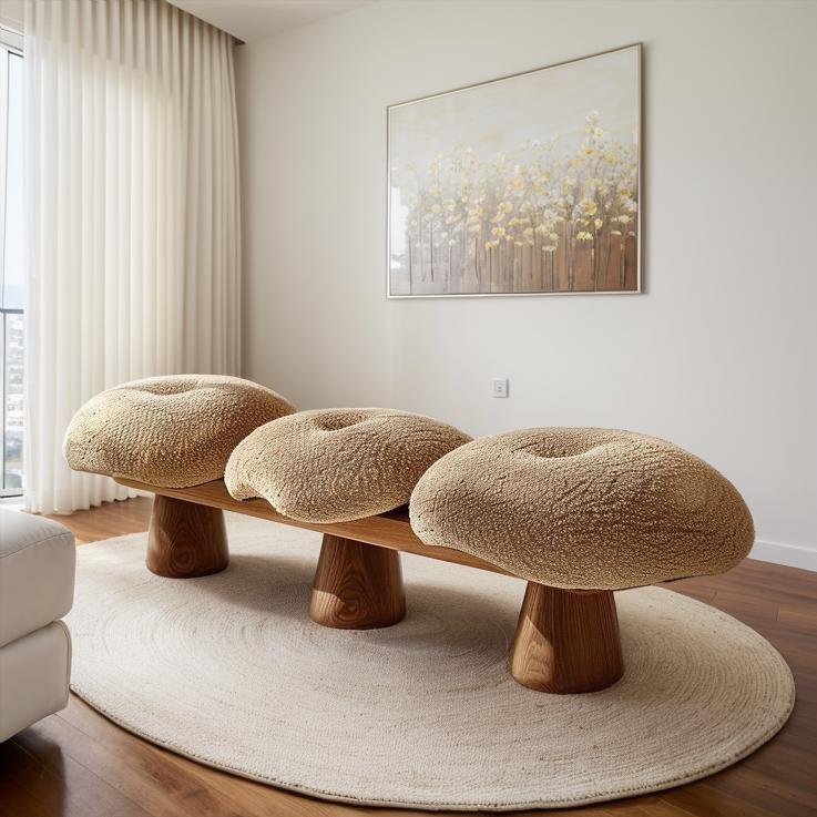 This Stylish Living Room Features A Uniquely Designed Bench With Plush Textured Seats And Wooden Legs