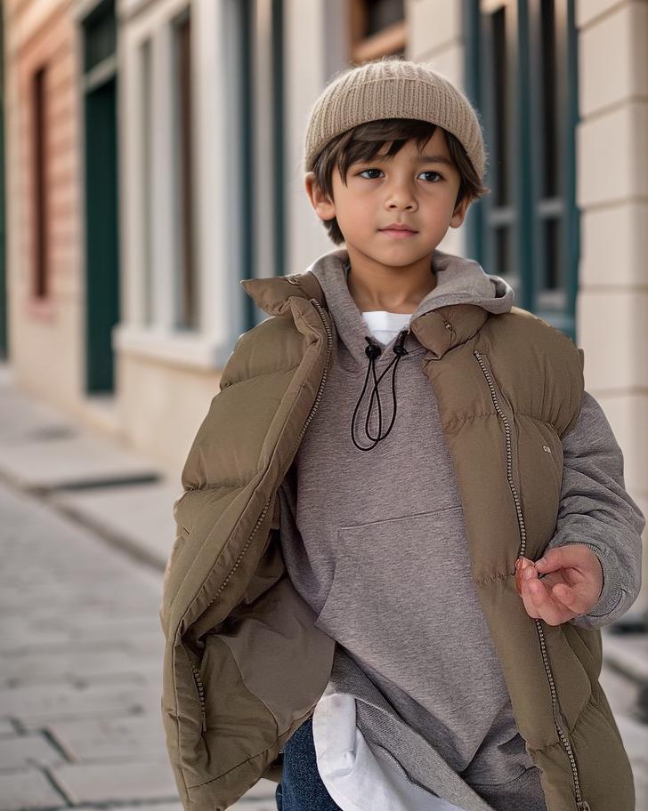 A Young Child Wearing A Beanie And Puffer Jacket Walks Down A Quaint European-Style Street