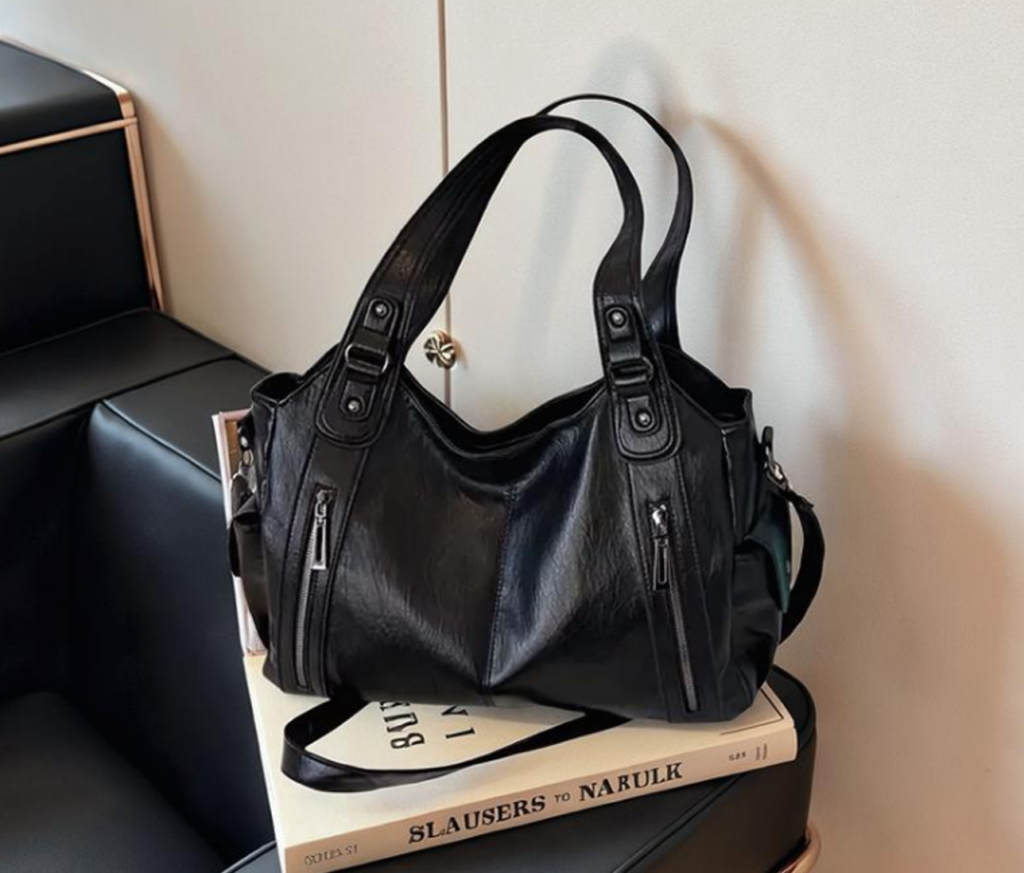 “Create a short commercial-style video featuring a woman holding a black leather handbag. She’s walking down a sunlit city street in a chic minimalist outfit, the camera following her from a side angle. As she pauses, she adjusts the bag on her arm and glances at it with a confident smile. The video should capture close-up shots of the leather texture and metal details as she moves. Add soft background music and natural lighting that highlights both the model’s movements and the bag’s elegant design.”