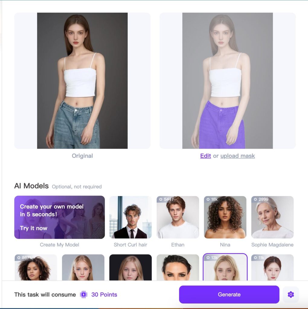 Open the cloth change AI tool and upload the selected photo. Use the selection tool to highlight the clothing area. Accurate selection ensures precise editing. Some tools offer an AI brush for automatic detection. Adjust the selection manually if needed. For example, in the below case, only the bottom part is chosen and we would like to change the top part.