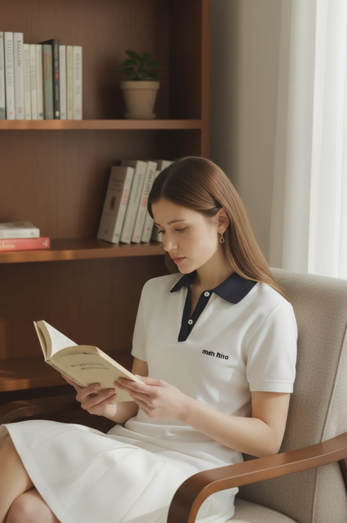 “Create a relaxed sitting pose on a sofa, legs crossed naturally, soft smile.”