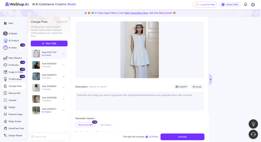 The WeShop AI Pose Generator effortlessly adjust a model’s pose, angle, and expression, while maintaining intricate details like fabric textures, clothing fit, and background lighting. This tool is a game-changer for professionals and small businesses who want to enhance their visual content quickly and efficiently.