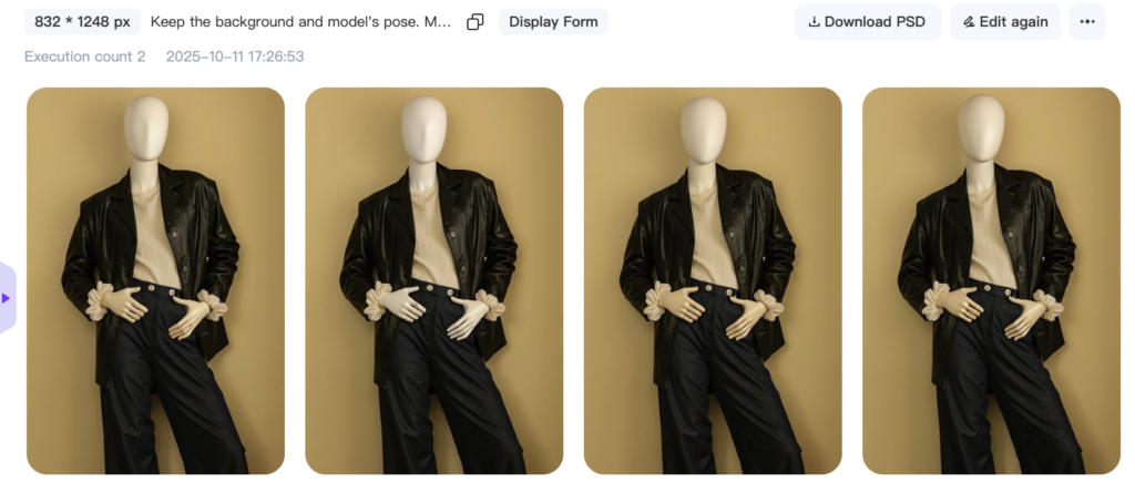 Want to refine the output? Use natural language “prompts” to describe the mannequin—like “slimmer waist” or “remove hair.” AI will automatically adjust the mannequin’s shape and appearance to your description.