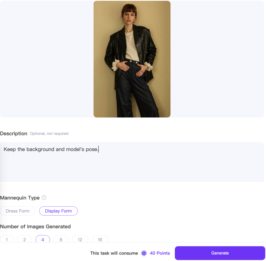 A: It depends on your subscription plan with Weshop AI. To generate a Mannequin, it only costs 10 points per image, with rate of $0.003-$0.005 per point.