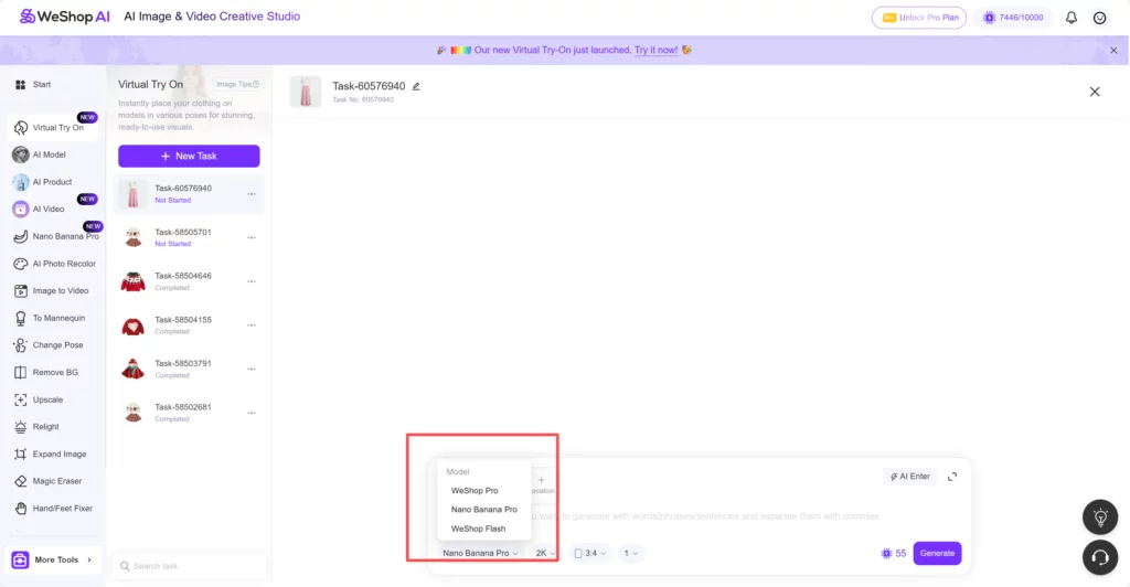 Under the prompt area, you can select which generation model you want to use. Previously, you could choose between WeShop Pro and Nano Banana Pro. Both are powerful and detailed, especially for high-end visuals or hero images.
