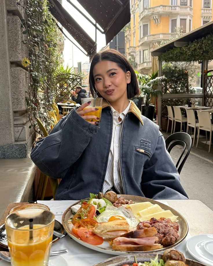 Prompt: Place the pasta from the second photo on the table in front of the girl, keeping her pose, facial expression, lighting, and the café atmosphere exactly as in the first photo. Replace the girl’s outfit with the full outfit from the third image (top, pants, shoes, and bag), keeping her pose, facial expression, lighting, and the café environment exactly the same.