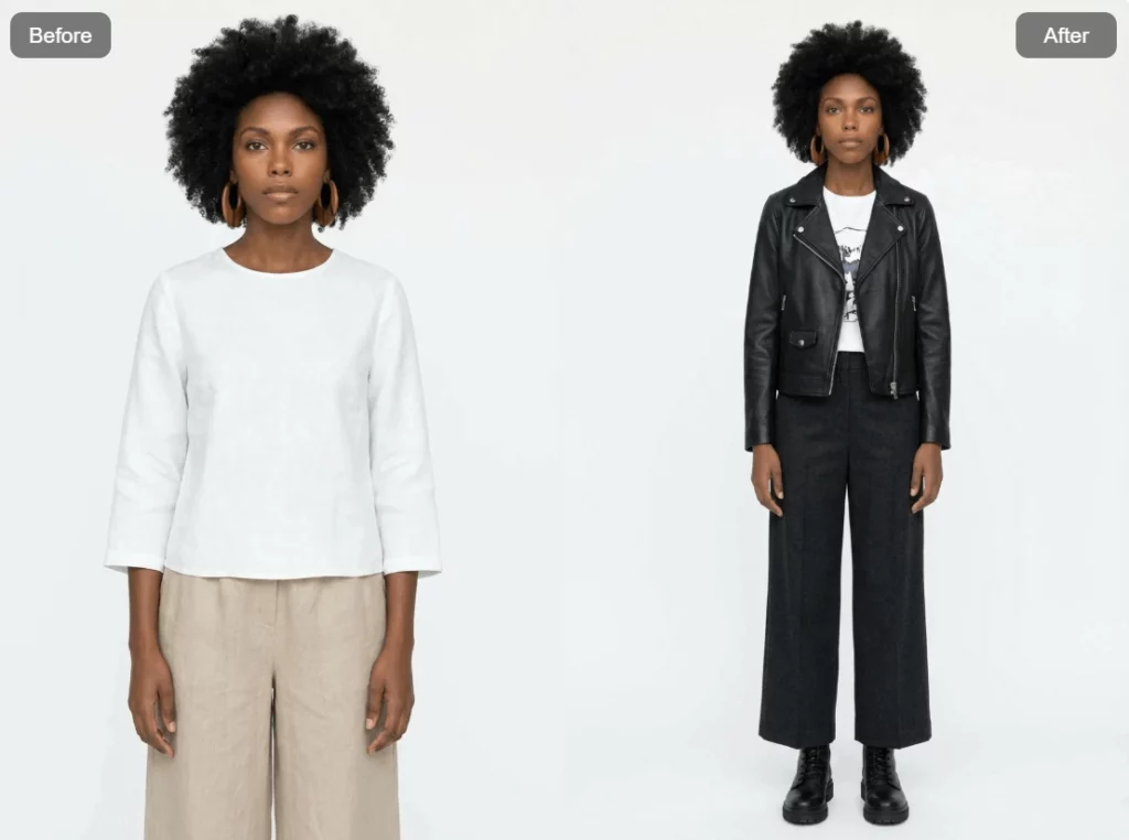 Outfit Generator by WeShop AI creates complete new outfits from a single image, keeping pose and background unchanged for fashion content creation.