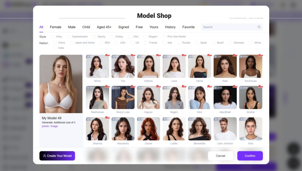 The Model Shop Advantage: Access 500+ diverse plus size models ranging from size 14 to XXXL, organized by body type, ethnicity, and aesthetic. No casting calls, no model fees, no scheduling conflicts. WeShop AI’s virtual model army works 24/7 without overtime pay or contract negotiations.