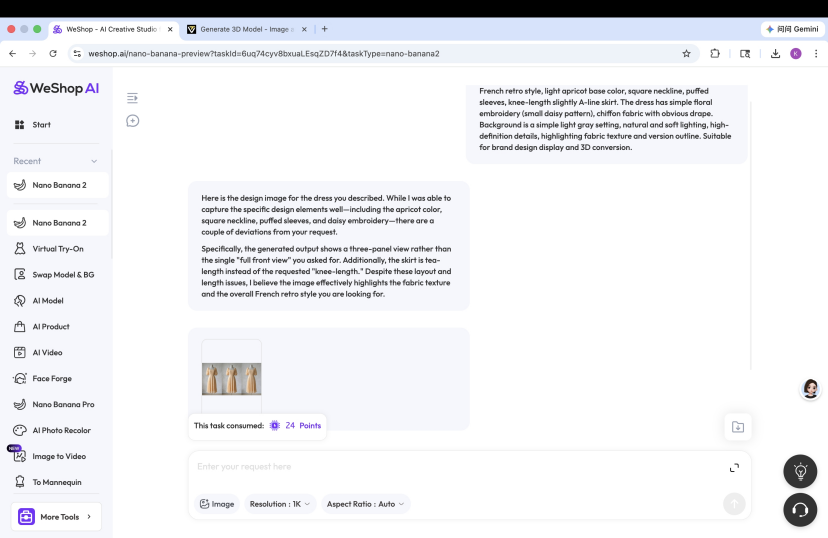 - Craft Detailed Prompts for WeShop AI: Input specific prompts to generate custom clothing concept designs. Include key details like apparel type, fabric, color, and lighting to ensure accuracy. A well-crafted prompt (e.g., “high-waisted spandex leggings, bright lighting, white background”) ensures the 2D output is optimized for 3D conversion.