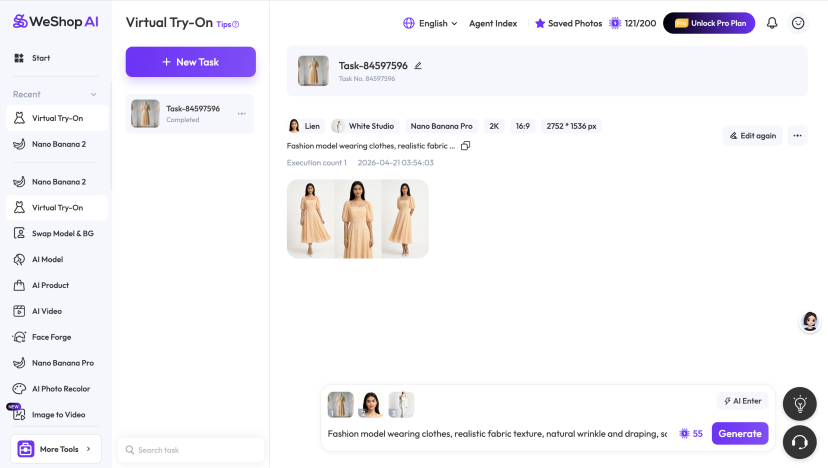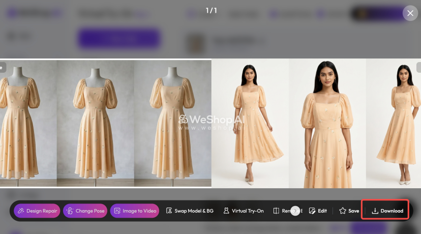 - Refine 2D Visuals in WeShop: Use WeShop’s AI Model Try-On to add realism and visualize the design on diverse body types. Adjust lighting to be even and neutral, tweak the background for clarity, and refine the pose to highlight key features. This step ensures 2D visuals are consistent and ready for 3D integration.