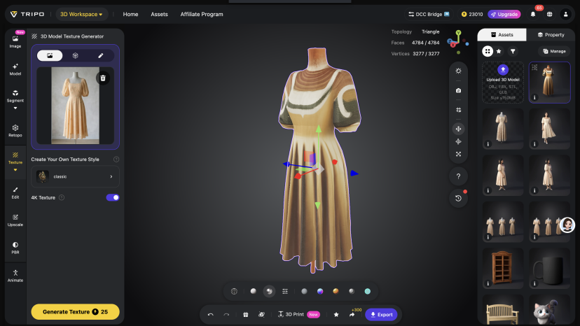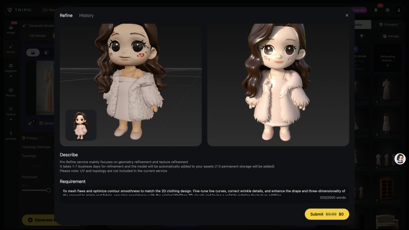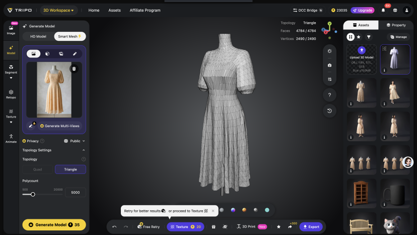 - Optimize 3D Mesh Details in Tripo: Make refined adjustments to the generated 3D base mesh, fix mesh flaws, and optimize contour smoothness to ensure the apparel’s fit matches the 2D design. Use Tripo’s mesh editing tools to fine-tune line curves and correct wrinkle details, making the 3D model more consistent with the drape and three-dimensionality of real clothing, laying the foundation for subsequent texture addition.